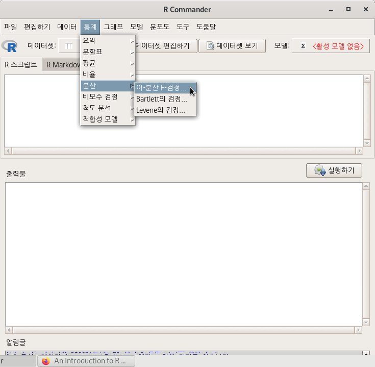 datasets > airquality R이 시작될 때, datasets 패키지가 자동으로 호출된다. 따라서 R Commander를 실행할 때, datasets 패키지는 첨부 패키지화되어 메뉴창을 통해서 내부 데이터셋을 찾고 불러올 수 있다.
