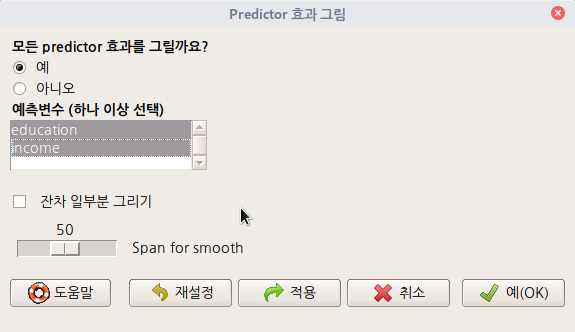 summary(LinearModel.1)LinearModel.1 모형이 활성화된 이후, '모델 > 그래프 > Predictor 효과 그림...' 메뉴 기능을 선택하면 아래와 같은 하위 화면이 등장한다. 예측변수 두개를 모두 선택한다. 메뉴 창 오른쪽 끝 아래에 있는 예(OK) 버튼을 누른다.